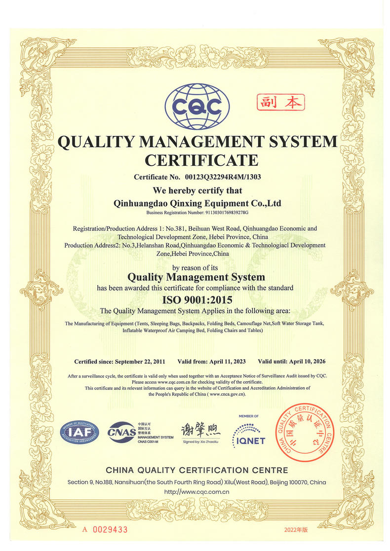 秦皇島秦興裝具有限公司有限公司源于我國(guó)第3524工廠,創(chuàng)建于2005年,占地面積30畝,是一家致力于研究,發(fā)展,制造和銷售為一體的綜合性裝具及紡織服裝加工生產(chǎn)企業(yè),我們的主要產(chǎn)品有單、棉帳篷,民用帳篷,旅游帳篷集各種機(jī)工產(chǎn)品等。